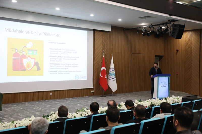 Olası afet ve acil durumlarda personelin görev ve sorumluluklarını bilinçli, doğru ve etkili bir şekilde yerine getirebilmesini amaçlayan eğitim, Sivil Savunma Uzmanı Öğr. Gör. Ali DİLMEN tarafından gerçekleştirildi. Eğitimde; sivil savunmanın önemi, ekiplerin görev tanımları, afet ve acil durumlarda haberleşme ve koruma faaliyetlerinin yürütülmesi konularında bilgilendirmelerde bulunuldu.